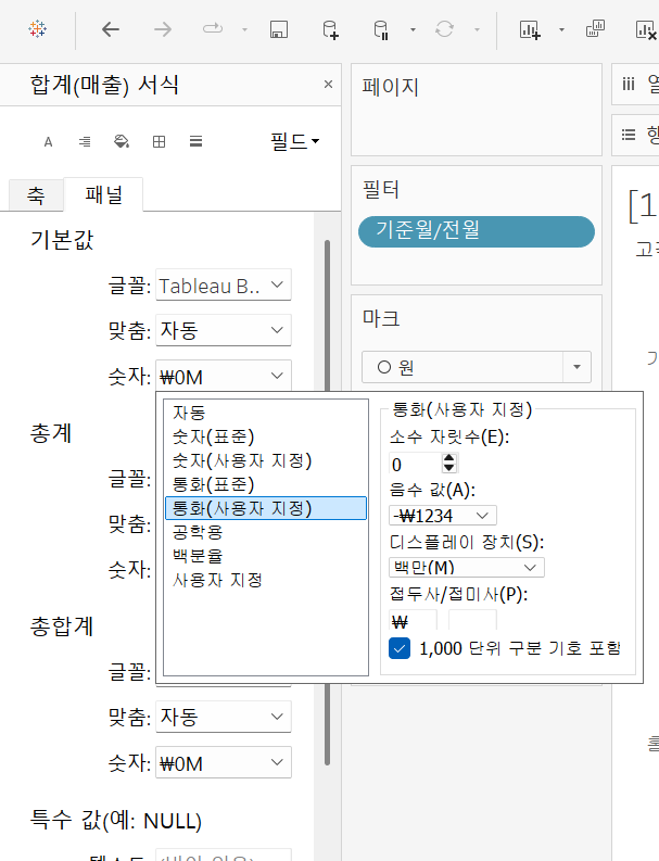 - 합계[매출] - 오른쪽 버튼 - 서식