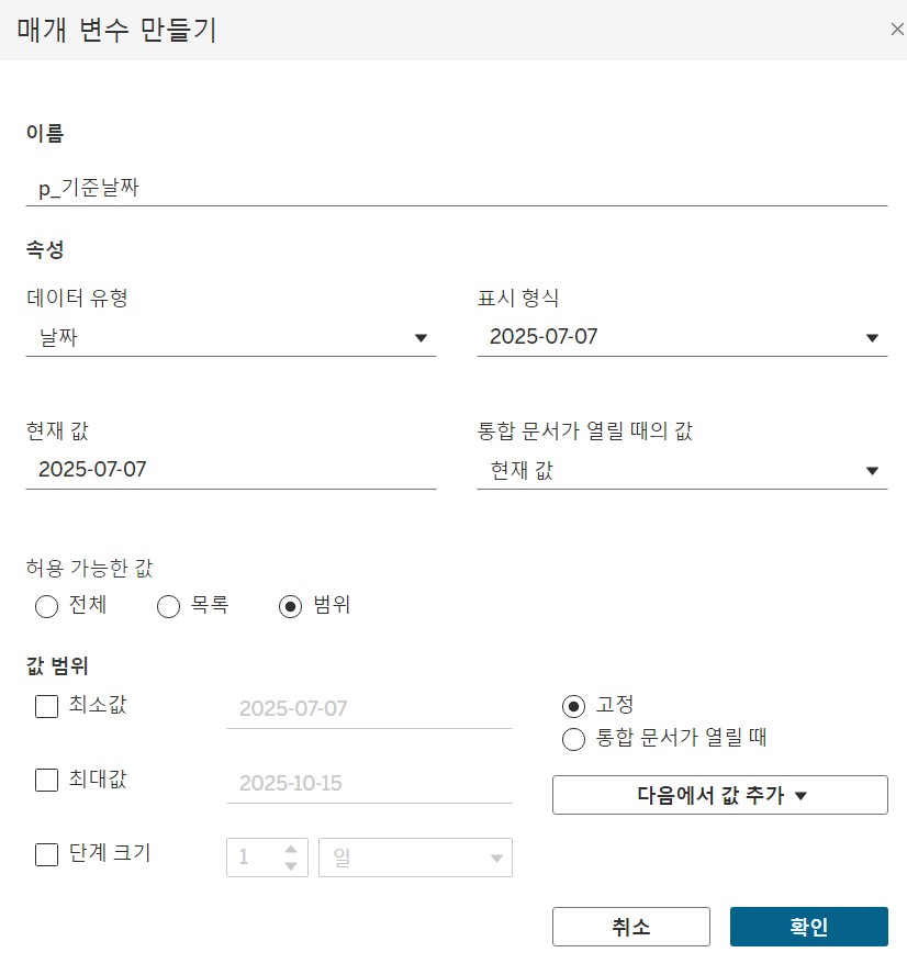 1-1. 기준날짜를 선택할 수 있는 날짜 유형의 매개 변수 생성