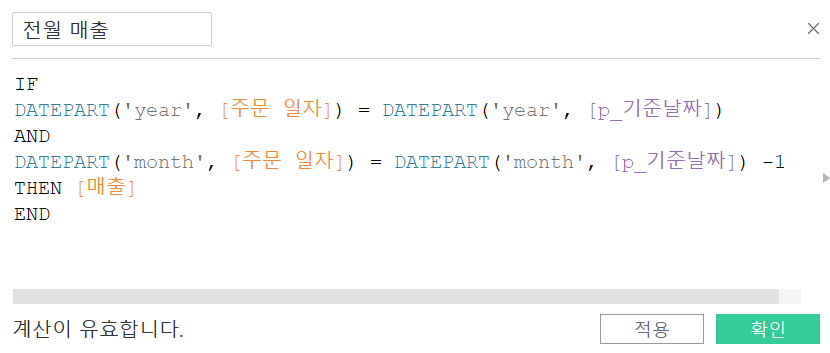 DATEPART('month', [주문 일자]) = DATEPART('month', [p_기준날짜]) -1