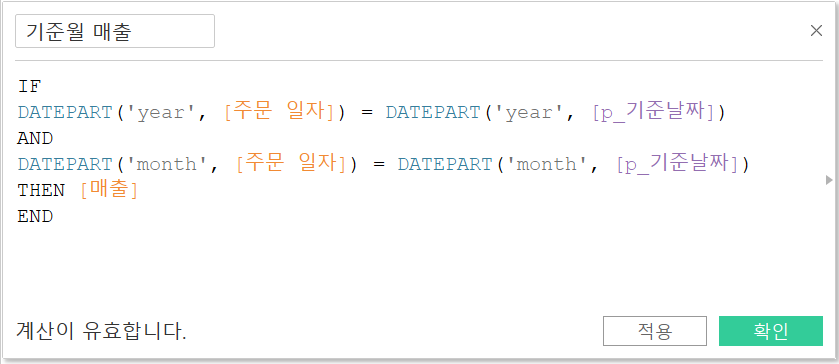 DATEPART('month', [주문 일자]) = DATEPART('month', [p_기준날짜])